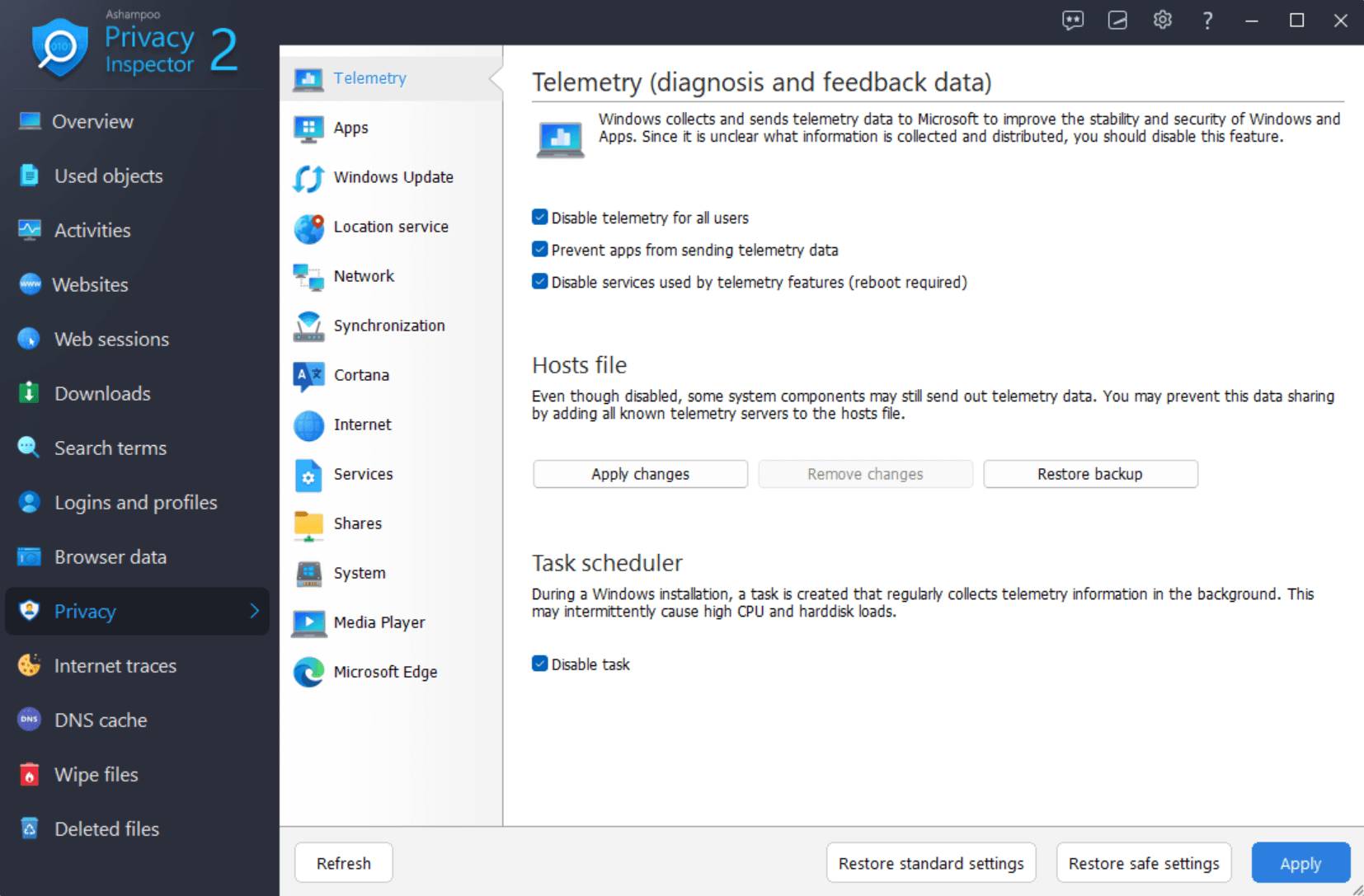 Learn everything about the events on your PC! Windows collects data about your usage habits and what you do online. But what exactly is being recorded, and what can you do about it? From detailed evaluations of all PC activities, a look into the DNS cache, to comprehensive security settings–everything is revealed! Ashampoo Privacy Inspector 2 offers fascinating insights into the inner workings of Windows, including activities that are being logged, and returns maximum privacy back to you! Features View used objects neatly arranged Safely delete confidential usage data Analyze web browsing behavior for all user accounts Multiple search filters for fast and precise results Display page visits by time and frequency Retrace online activities in detail Delete what other cleaners leave behind Review and delete download history Analyze online search behavior and identify top search terms Keep an eye on logins and form inputs Erase internet traces and usage logs Disable telemetry and unwanted data sharing Safeguard and protect your data and privacy Limit usage rights for apps Prevent location tracking, data syncing, and personalized ads Activities module reveals all significant events DNS Cache module with detailed display and clearing function Internet Cleaner with deletion history and support for the latest browser versions File Wiper for permanently deleting sensitive data Numerous new privacy settings for Windows and apps Search term logging for all browser profiles and Windows Explorer Optimized performance through memory management and multi-core support