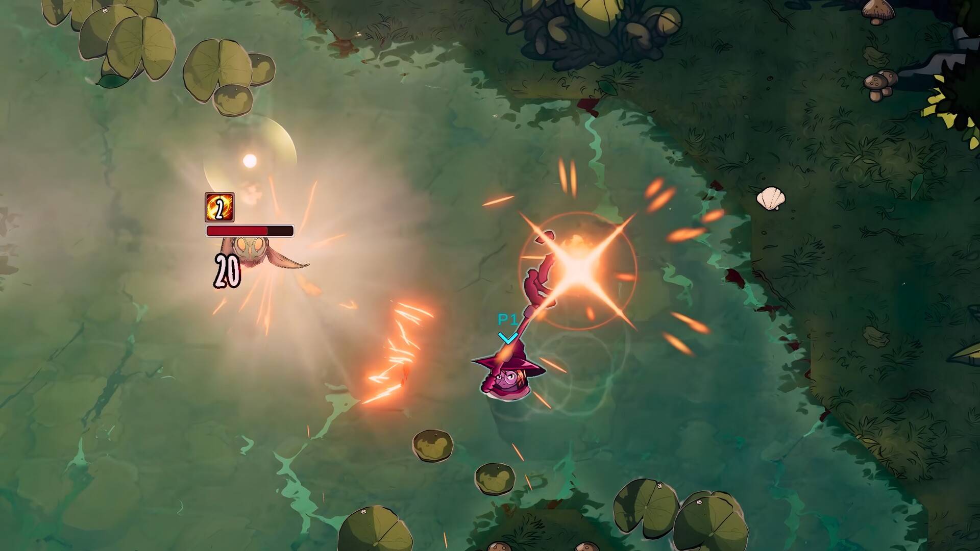 For 1-2 Players The deeper you go into the Haunted Swamp, the more you feel Witch Maeve’s influence. She has bent the creatures here to her will, turning them into cursed abominations. If you want to break free, you’ll have to become stronger. Take control of a water spirit in this co-op action roguelite for one or two players. Explore a haunted swamp where decay and beauty intertwine, battle relentless enemies, and adapt to ever-changing challenges while evolving your powers with every run. Get ready for thrilling boss battles that will put your skills to the test. Summon and command Guardians, natural turrets that fight alongside you, turning the battlefield into a dynamic mix of strategy and chaos. Experiment with unique abilities, adapt your tactics on the fly, or combine powers with a friend to overcome increasingly dangerous threats as the swamp itself fights back. Features Guardians: Deploy and modify nature’s guardians to change the course of the fight Unique Playable Heroes: Each with their own weapons and special abilities Skills & Items : Stack absurd builds, experiment with upgrades, and break the game in the best way Permanent Progression: Improve your character and guardians over time, unlocking new powers and upgrades that carry across runs Online Co-op (1 or 2 players): Team up with a friend and fight through the chaos together Endless Replayability : Every run brings new enemies, challenges, and surprises Difficulty System: An unlockable difficulty system keeps every run fresh and challenging once you finish the game